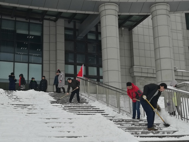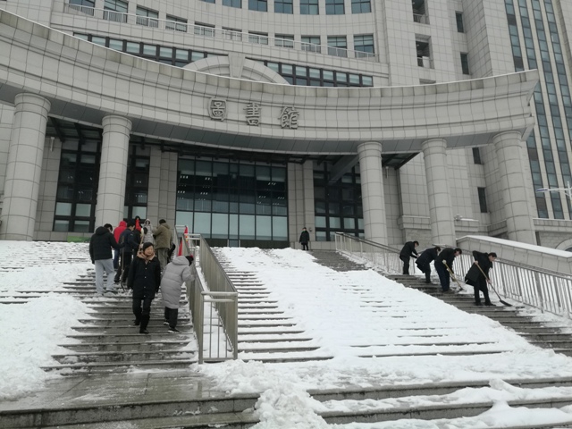 1月26日上午,为防止台阶积雪给师生进出图书馆带来不便,排除安全隐患,图书馆党支部党员集体行动,开展了除雪义务劳动。同志们冒着刺骨的寒风,挥舞铁铲和扫帚,经过近2个小时的辛苦劳动,在图书馆西门、北门清理出安全通道,为师生通行提供了方便。