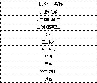 ◆ 分类体系:参考《中图法》(即中国图书馆图书分类法)学科分类,结合科技报告分类特征进行的三层学科分类,有9个一层分类,向下分为78个二层分类,包含909个三层分类。
