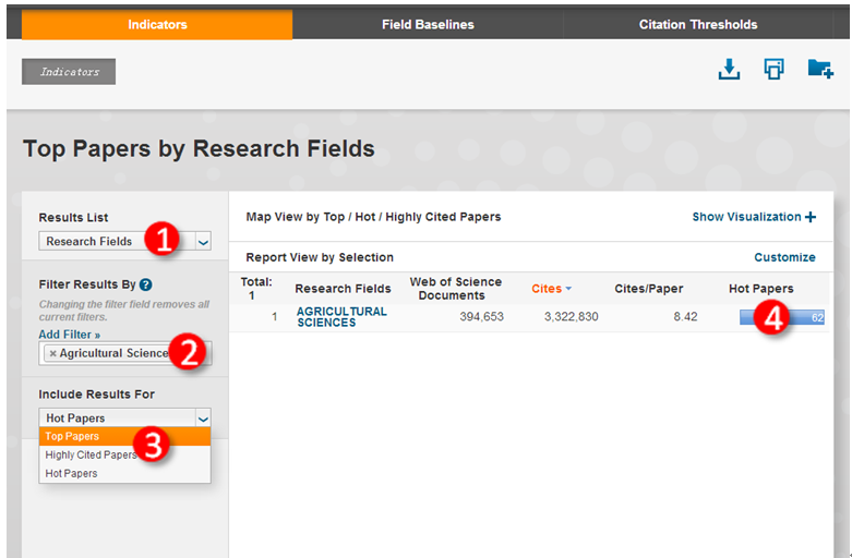 ①在指标选项界面,选择研究领域(Research Fields);