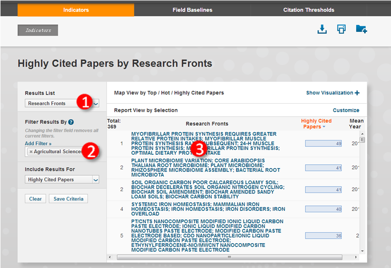 ③如选择高被引论文为文献输出类型,在结果区从左至右依次显示了研究前沿的数量(Total)、研究前沿的具体内容(Research Fronts)、高被引论文数(Highly Cited Papers) 和平均年(Mean Year)。