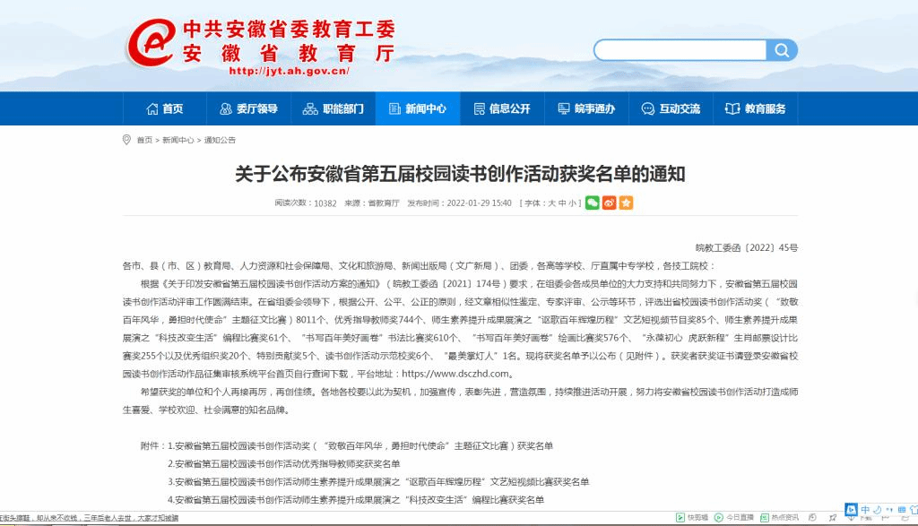 近日安徽省第五届校园读书创作活动获奖名单在安徽省教育厅网站公布。校园读书创作活动由安徽省委教育工委、省教育厅、省人社厅、省文化和旅游厅、省新闻出版局、团省委共同举办,同时也是书香安徽全民阅读活动重点活动之一。在本次活动中,我校图书馆精选的优秀征文共有26篇获奖,其中卞小宝、刘杨、韩亚林、韩泊绪、马懿筠5位同学获得校园读书创作活动奖大学生组一等奖,这5位同学的指导老师获得优秀指导教师一等奖;刘爱环等6位同学获得二等奖,陈鑫等8位同学获得三等奖,徐诺等7位同学获得优秀奖;我校选送的师生素养提升成果展演节目《大学生说党史:我家乡的红色故事》(微视频)获得高等教育组三等奖;丁惠老师获得教师组一等奖,刘晓鹏老师获得三等奖;我校获优秀组织奖。