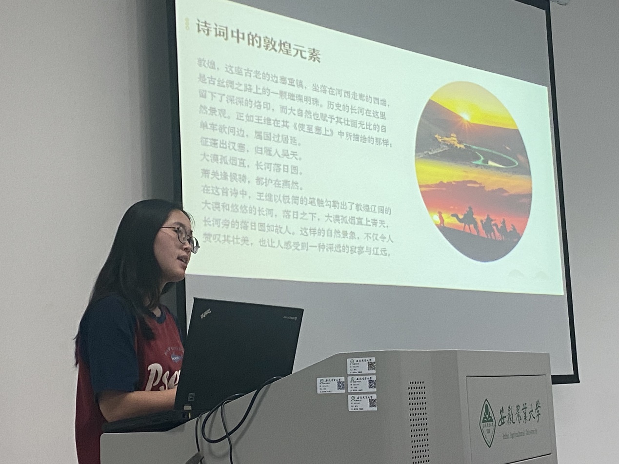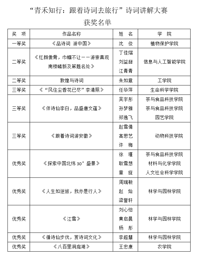 5月18日,我校首届阅读文化节系列活动之“青禾知行:跟着诗词去旅行”诗词讲解大赛在图书馆成功举办。参赛同学以PPT为载体,以诗词为线索,跟随古人足迹,游览锦绣山河,追寻文化基因。参赛作品题材广泛、角度新颖、内容丰富。经过激烈的角逐,决出一等奖作品1个、二等奖作品2个、三等奖作品3个。其中,植物保护学院沈俊的《品诗词、游中国》作品荣获一等奖,信息与人工智能学院丁佳熠、刘益甜、江青青合作的《红颜傲骨,巾帼不让——游崇真观南楼睹新及第题名处》、工学院朱如意的《敦煌与诗词》作品获二等奖。