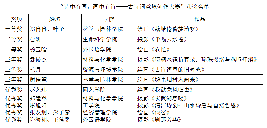 本次大赛历时月余,吸引了全校百余位学子积极参与,共征集到摄影、绘画作品70件。同学们通过镜头、画笔与诗词的巧妙融合,生动诠释了古典诗词的意境之美。参赛者以新颖的表现手法,既传承了中华优秀传统文化,又注入了当代青年的创新思考,充分彰显了“诗画合一”的艺术魅力。