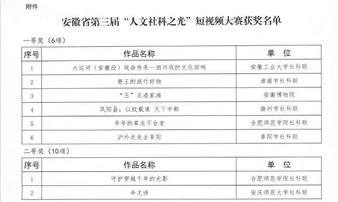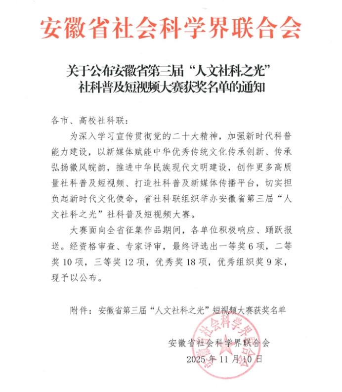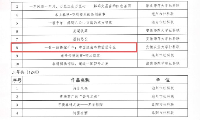 本网讯 近日,安徽省社会科学界联合会公布了安徽省第三届“人文社科之光”社科普及短视频大赛获奖名单,我馆朱建军、刘静娴、徐藤舞老师报送的作品《一针一线缝住千年:中国线装书的前世今生》喜获二等奖。