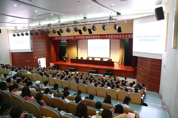 本网讯 9月19日下午15:00,“时代书苑·青禾讲坛”迎来了2018年第7讲(总第16讲),安徽省历史文化研究中心主任翁飞教授作客青禾讲坛,在校图书馆第1学术报告厅为我校师生做了一场题为“大合肥的历史文化底蕴”的读书报告会。本次活动由校图书馆、现代教育信息中心、人文社会科学学院、校团委主办,图书馆新媒体团队、图书馆学生服务中心团队、图书馆微传媒团队、青禾书店创业团队、青禾讲坛服务团队协办。