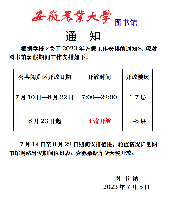 图书馆关于2023年暑假工作安排的通知