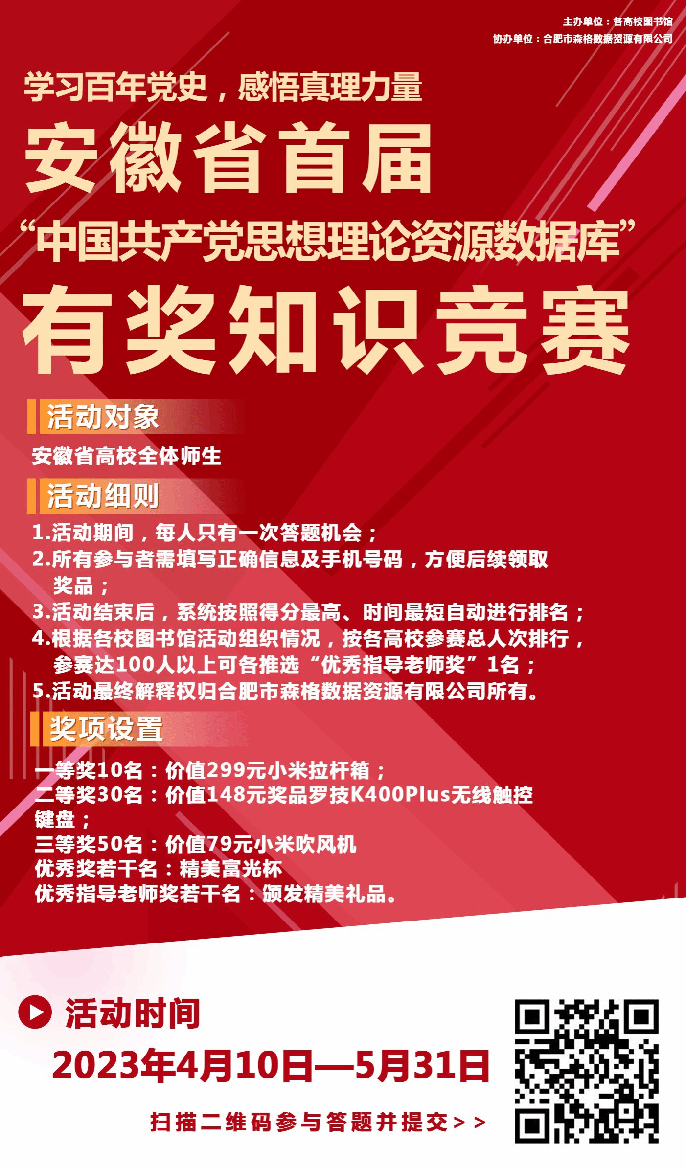 为了促进各高校广大师生更好地使用“中国共产党思想理论资源数据库”,助力师生思想理论研究与学术论文撰写,各高校图书馆联合合肥市森格数据资源有限公司举办“中国共产党思想理论资源数据库”有奖知识竞赛活动,欢迎广大师生积极参加!