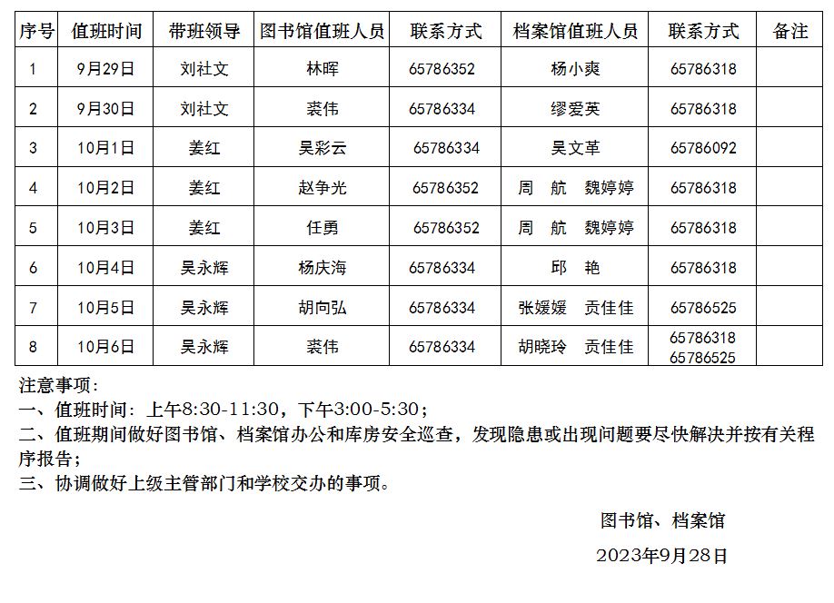 图书馆、档案馆2023年中秋、十一假期值班表