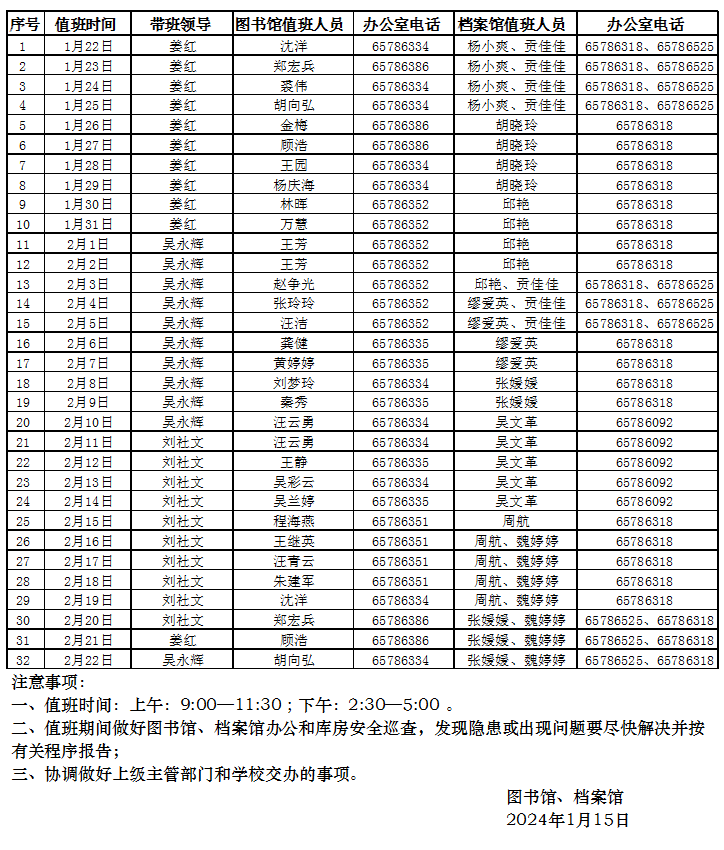 图书馆、档案馆2024年寒假值班表(2024年1月22日-2月22日)