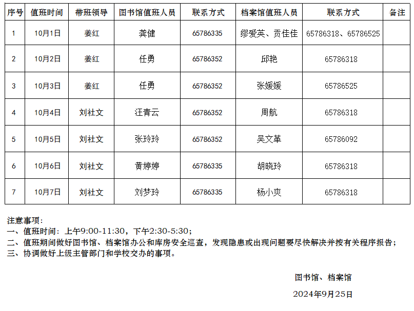 图书馆、档案馆2024年国庆假期值班表