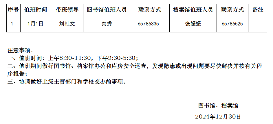 图书馆、档案馆2025年元旦假期值班表