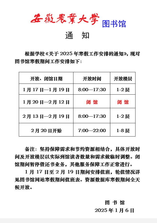 图书馆关于2025年寒假工作安排的通知