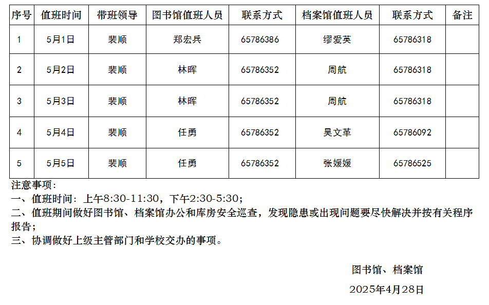 图书馆、档案馆2025年五一节假期值班表
