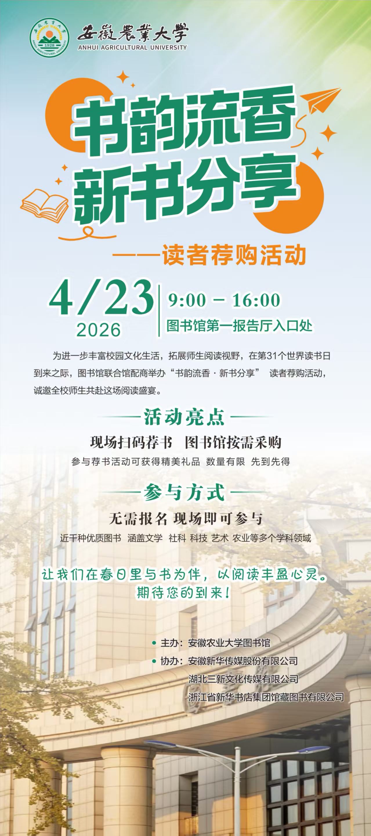 为进一步丰富校园文化生活,拓展师生阅读视野,在第31个世界读书日到来之际,图书馆联合馆配商举办“书韵流香·新书分享”读者荐购活动,诚邀全校师生共赴这场阅读盛宴。