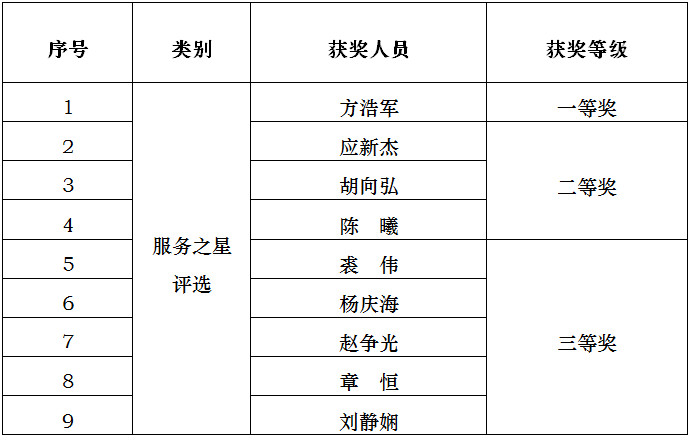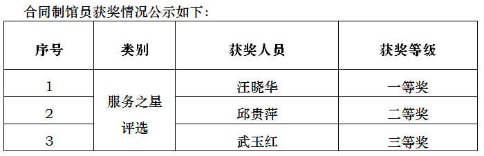 按照服务之星评选方案,分正式馆员、合同制馆员分2个评选小组,按照百分制公开打分的办法评选服务之星,馆长、图书馆、现代教育信息中心年度考核小组、全体馆员各占40%、40%、20%的权重累计得分;上一年获得服务之星一二三等奖的馆员,在下一年评选中,在评选综合得分一二三等奖各自减1.5分、1分、0.5分的情况下,再评一二三等奖。正式馆员获奖情况公示如下:
