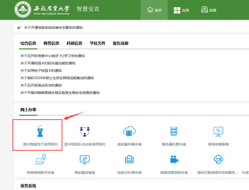 二、点击网上办事应用版块里的“图书馆报告厅使用预约”。