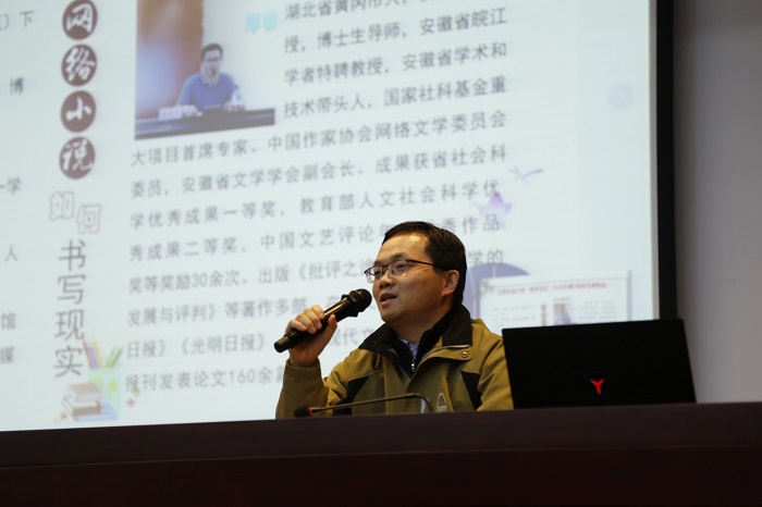 12月2日下午2:30,图书馆第一报告厅举办了“时代书苑·青禾讲坛”2020年第3讲(总第28讲),中国作家协会网络文学委员会委员、安徽省文学学会副会长、安徽大学博士生导师周志雄教授为我校师生做了一场题为“网络文学如何书写现实”的专题报告。此次活动由图书馆、信息化办公室、人文社会科学学院、团委主办,图书馆新媒体团队、图书馆学生服务中心团队、图书馆微传媒团队、青禾悦读推广团队协办。