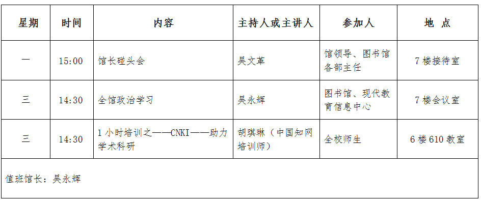图书馆一周安排表(2019年10月28日——2019年11月1日)