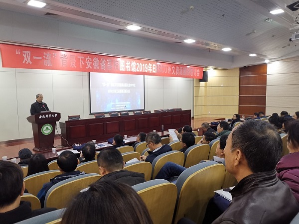 本网讯 2019年12月17日下午,为更好地助力图书馆资源优化配置与服务管理,提升“双一流”背景下的学科服务水平,由安徽省高等学校图书情报工作委员会、安徽省高等学校数字图书馆主办,安徽农业大学图书馆、合肥蓬桉数据技术服务有限公司承办的“‘双一流’背景下安徽省高校图书馆2019年EBSCO外文资源建设研讨会”在我校图书馆第2学术报告厅成功举办。来自全省43所高校的74名图书馆负责人参加了此次会议。我校图书馆馆长吴文革主持会议。安徽省高等学校图书情报工作委员会秘书长、安徽大学图书馆馆长储节旺教授到会并致辞。