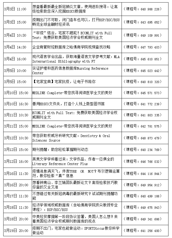 EBSCO数据库3月份线上培训正在进行中,欢迎广大师生参加。温馨提示:推荐手机参与,非常方便快捷。