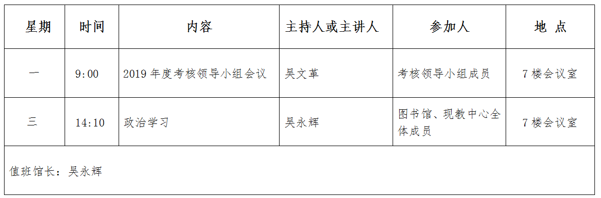 图书馆一周安排表(2020年1月6日——2020年1月10日)