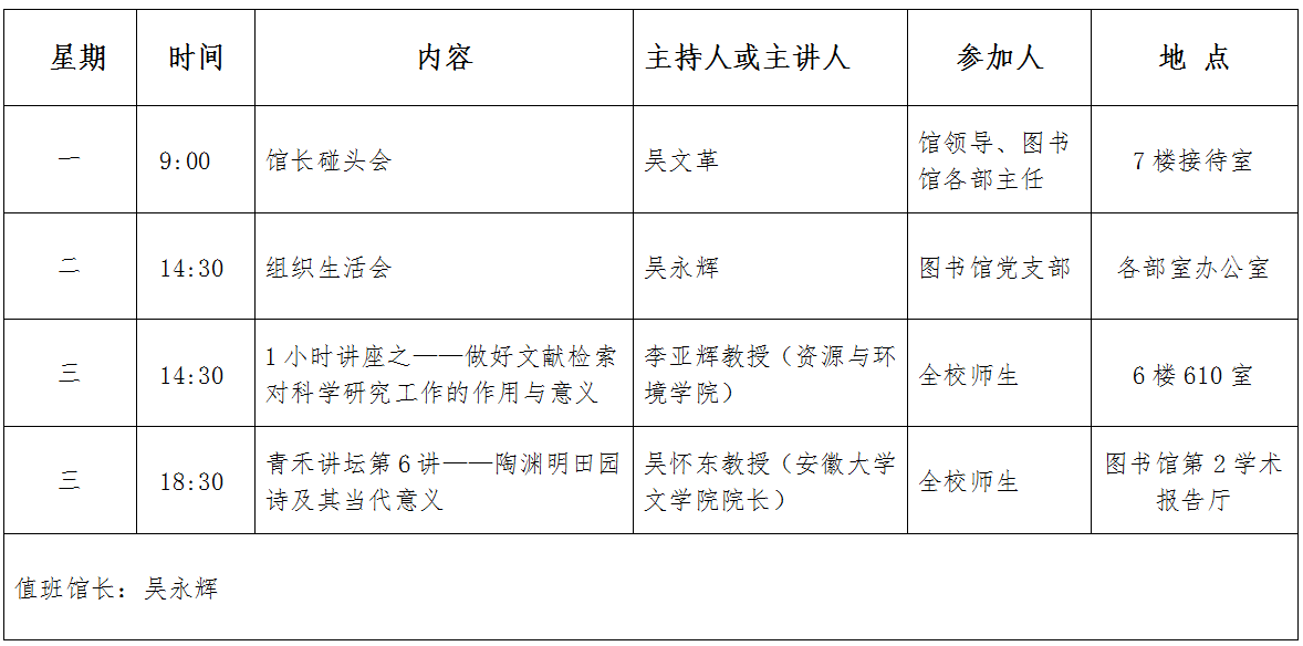 图书馆一周安排表(2019年12月9日——2019年12月13日)