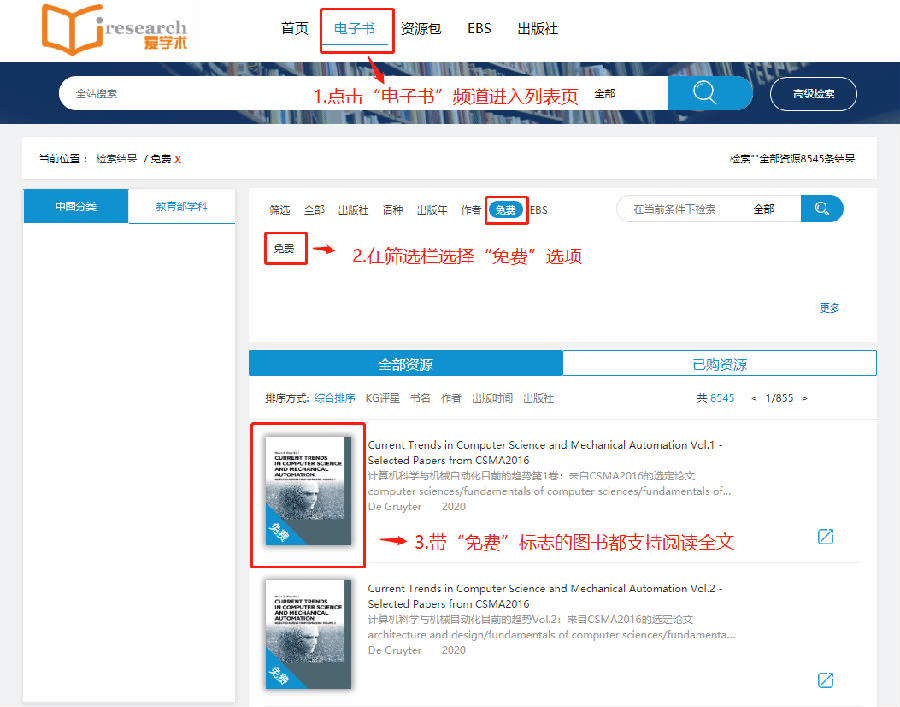 访问方式:电子书列表页→筛选条件→选择“免费”