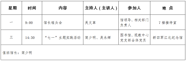 图书馆一周安排表(2019年6月24日——2019年6月28日)