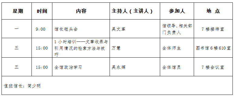 图书馆一周安排表(2019年6月10日——2019年6月14日)