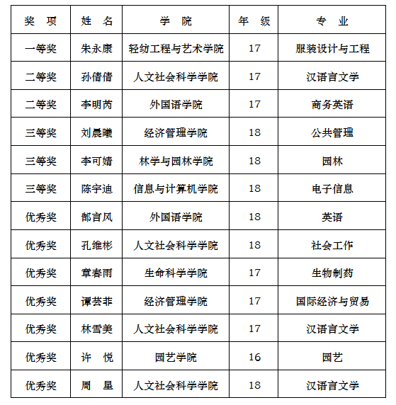 经过初赛和复赛选拔,共计有13位选手脱颖而出进入决赛。决赛设置8位评委,由来自图书馆、校党委宣传部、校团委的6位老师和校广播台、演讲与口才协会的2位同学组成。比赛采用选手自选经典著作或者在原有经典著作基础上进行改编、创作的作品,并自备配乐的方式进行诵读,每位选手限时5分钟,评委根据活动组委会预先设定的评选规则,现场打分,系统计分、实时播报的方式进行评选。最终,来自轻纺工程与艺术学院17级服装设计与工程专业的朱永康同学获得一等奖;人文社会科学学院的孙倩倩同学和外国语学院的李明芮同学获得二等奖;经济管理学院的刘晨曦同学、林学与园林学院的李可婧同学、信息与计算机学院的陈宇迪同学获得三等奖;郜言风等同学获得优秀奖。后续,活动组委会将对决赛中的参赛作品录制音频,推荐参加第五届书香江淮“品读经典 对话信仰 弘扬社会主义核心价值观”互联网阅读系列活动。