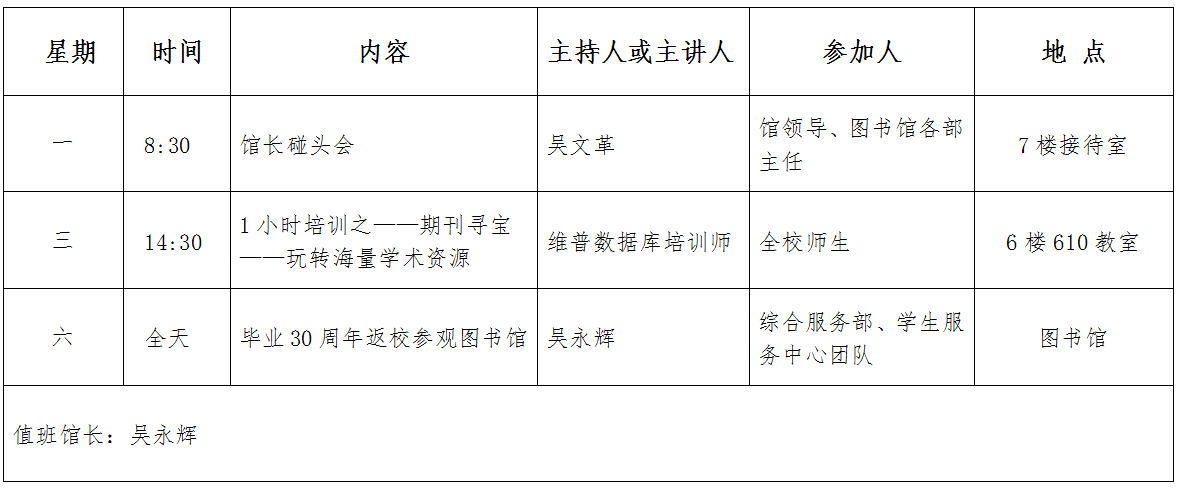 图书馆一周安排表(2019年10月14日——2019年10月19日)