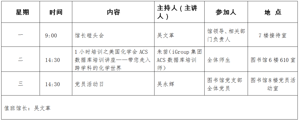 图书馆一周安排表(2019年4月8日——2019年4月12日)