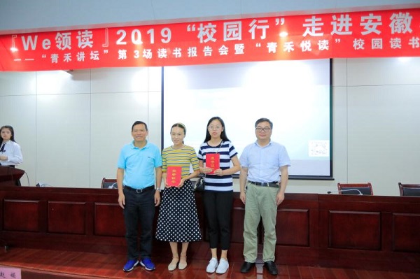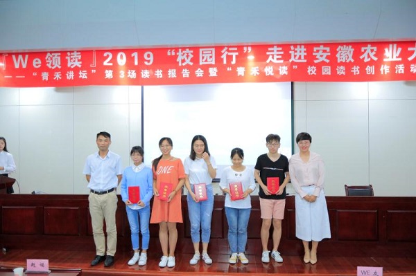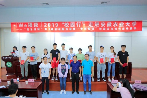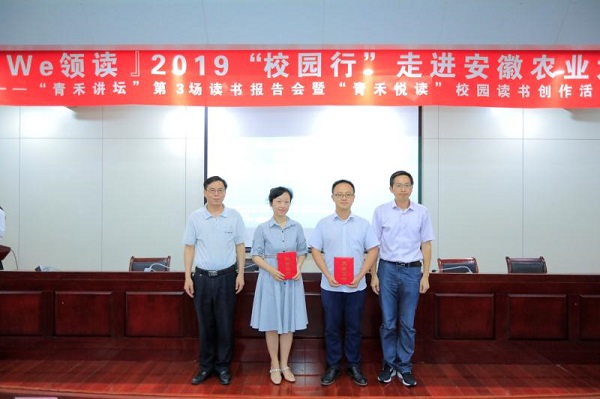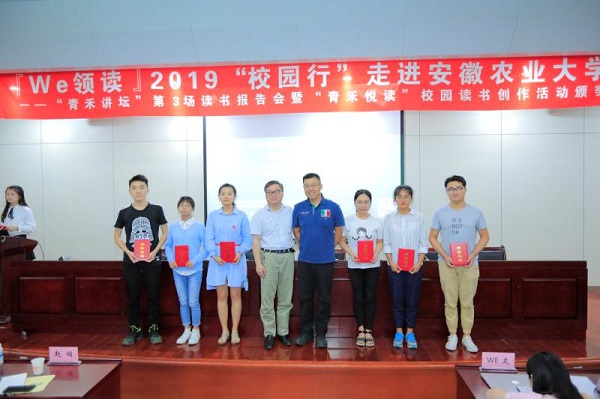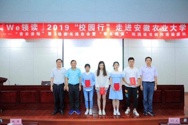 2019年6月18日晚7:00,由校图书馆、人文社会科学学院、团委主办,图书馆新媒体团队、图书馆学生服务中心团队、图书馆微传媒团队、青禾悦读推广团队协办,WE领读承办,芜湖方特旅游区特别支持的『We领读』2019“校园行”走进安徽农业大学——“青禾讲坛”第3场读书报告会暨“青禾悦读”校园读书创作活动颁奖在校图书馆第2学术报告厅圆满举行。 校党委宣传部夏成云副部长、人文社会科学学院方章东院长、『We领读』总策划赵媚、『We领读』领读者、中国科技大学管理学院院长助理赵征博士,、『We领读』学术顾问、中国科技大学出版社副编审杨振宁、『We领读』领读者、新华网安徽频道总经理助理鲁金茗等出席本次活动。校图书馆简少明副馆长、吴永辉副馆长率图书馆老师和百余名师生一起参加本次活动,校图书馆吴文革馆长为本次活动致辞。