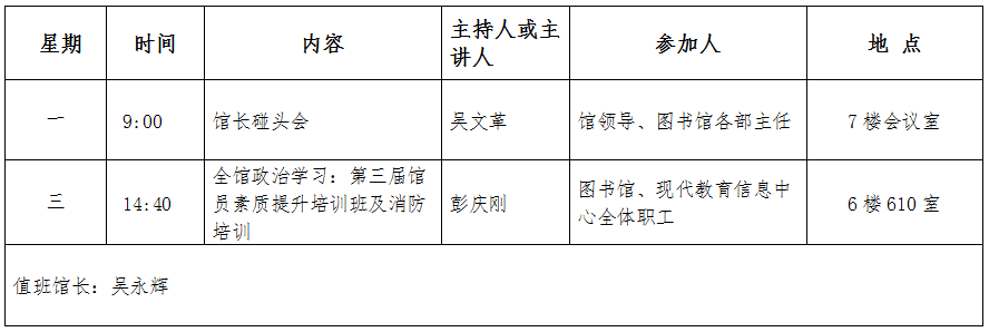 图书馆一周安排表(2019年8月26日——2019年8月30日)