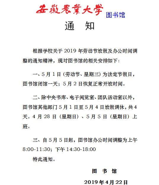 图书馆劳动节放假及办公时间调整的通知