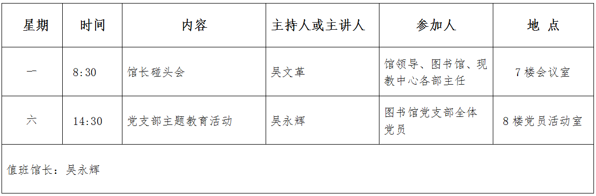图书馆一周安排表(2019年10月8日——2019年10月12日)