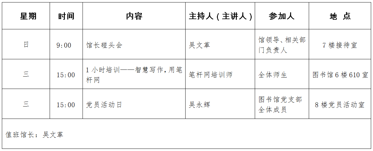 图书馆一周安排表(2019年5月5日——2019年5月10日)