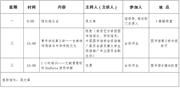 图书馆一周安排表(2019年5月20日——2019年5月24日)