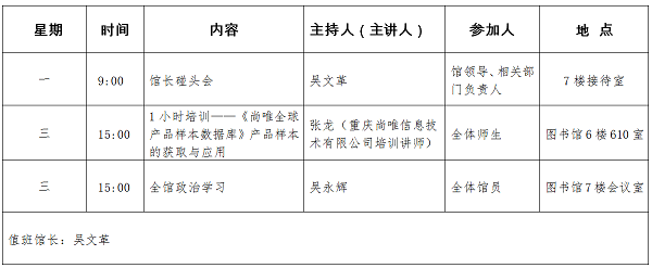 图书馆一周安排表(2019年5月27日——2019年5月31日)