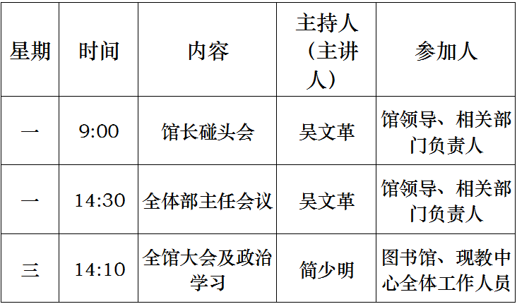 图书馆一周安排表(2019年3月4日——2019年3月8日)