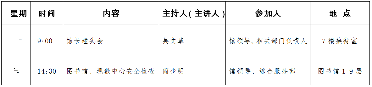 图书馆一周安排表(2019年1月21日——2019年1月25日)