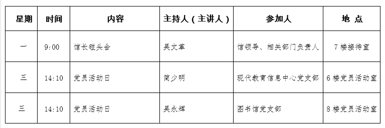 图书馆一周安排表(2019年3月4日——2019年3月8日)