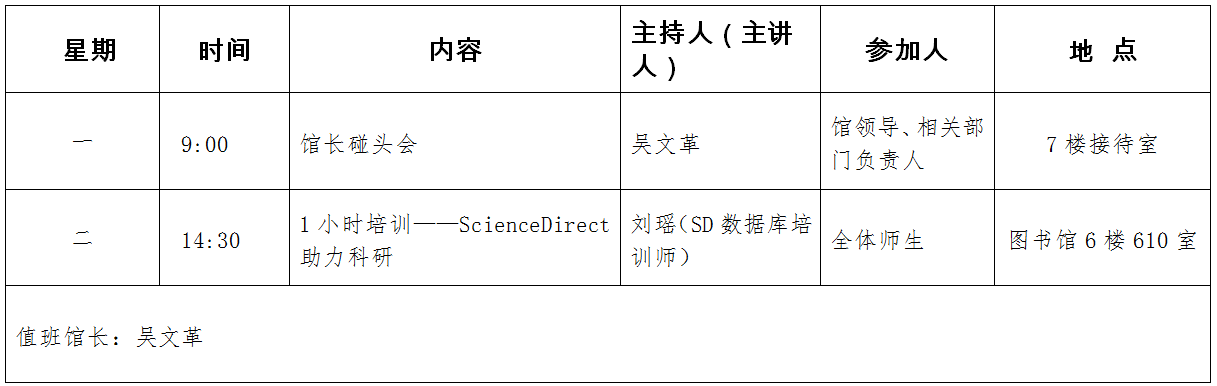 图书馆一周安排表(2019年4月1日——2019年4月4日)