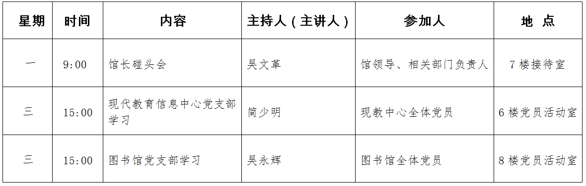 图书馆一周安排表(2019年1月7日——2019年1月11日)