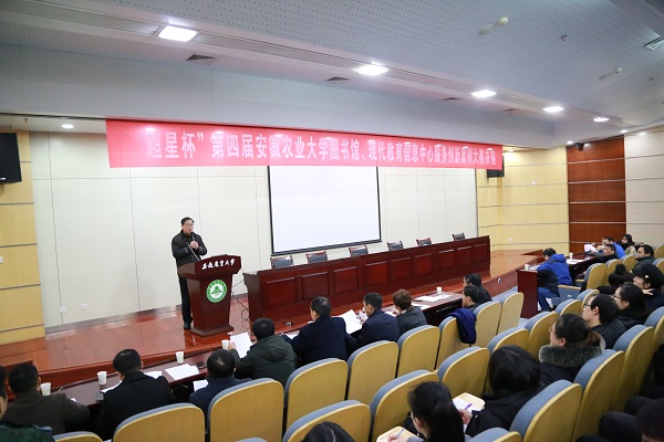 2018年12月26日下午2点10分,由安徽农业大学图书馆、现代教育信息中心主办,图书馆办公室、学生服务创新团队承办,安徽超星信息技术有限公司协办的“超星杯”第四届安徽农业大学图书馆、现代教育信息中心服务创新案例大赛决赛在校图书馆第2报告厅圆满落幕。本次大赛以“服务、创新、转型、发展”为主题,特邀合肥工业大学图书馆副馆长刘荣清,安徽大学图书馆副馆长彭少杰,安徽医科大学图书馆副馆长周国正,安徽建筑大学图书馆副馆长徐华洋,安徽中医药大学图书馆馆长方向明,合肥学院图书馆馆长昌超,合肥师范学院图书馆馆长吴秋芬,安徽医学高等专科学校图书馆馆长杨敏,安徽超星信息技术有限公司董事长秦文玉,图书馆副馆长、现代教育信息中心简少明,图书馆副馆长吴永辉共11人担任评审专家。图书馆吴文革馆长致开幕词并对本次大赛决赛有关事项做简要说明, 简少明副馆长主持本次大赛。