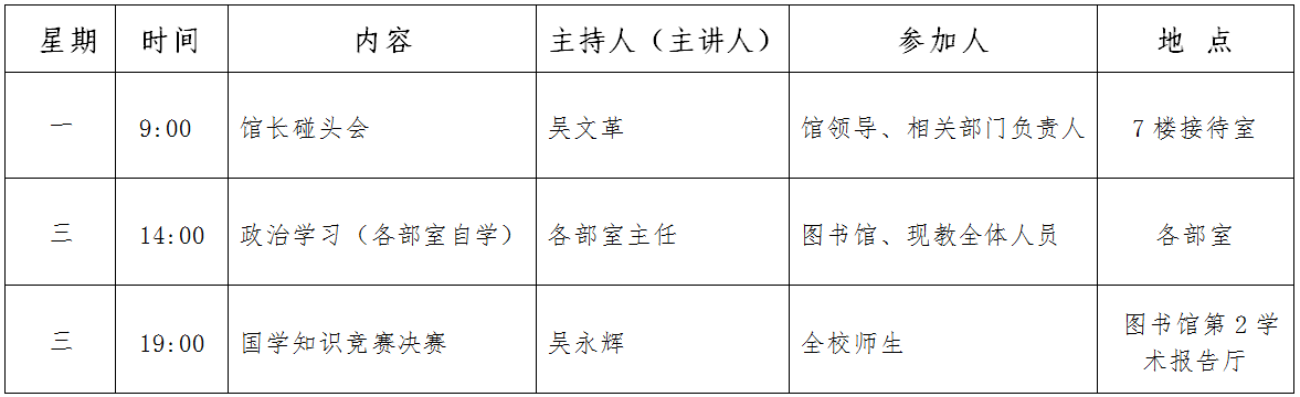 图书馆一周安排表(2018年12月10日——2018年12月14日)
