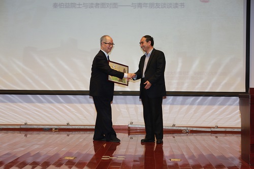 4月20日下午2点30分,由校图书馆、团委、安徽时代出版发行有限公司共同策划的“时代书苑·青禾讲坛”在图书馆第一学术报告厅正式启动,吴文革馆长主持启动仪式。中国工程院院士、军事医学科学院原院长秦伯益研究员受邀为我校大学生做了一场题为“与青年朋友谈谈读书”的首场读书报告会。校长程备久、副校长蒋家平、安徽时代出版传媒股份有限公司副总经理韩进,在肥高校各图书馆馆长、省市公共图书馆馆长,安徽时代出版发行有限公司,我校办公室、党委宣传部、团委、人文社会科学学院等单位负责人以及我校师生共计500人聆听了报告会。读书报告会开始前,程备久校长向秦伯益院士赠送我校大学生制作的手工艺纪念品。