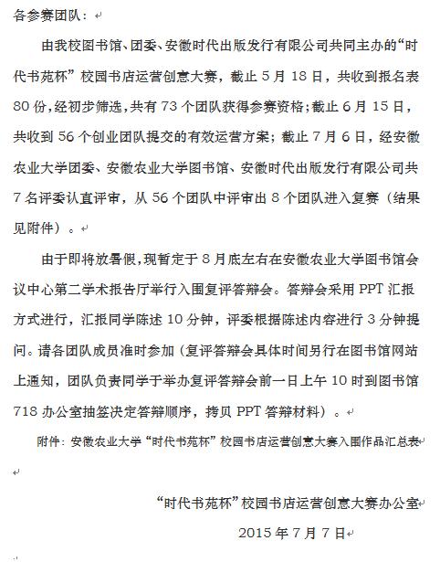 关于安徽农业大学“时代书苑杯”校园书店运营创意大赛初评结果的通报及复评答辩预通知