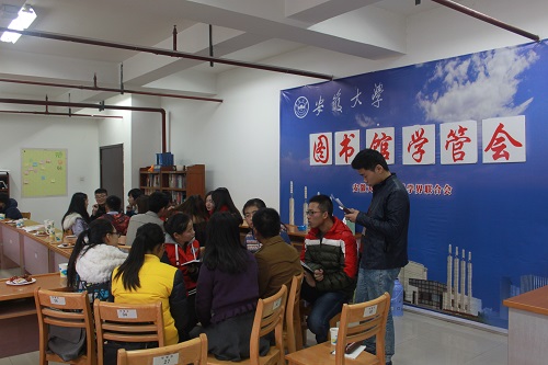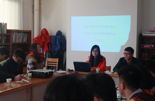 2015年11月28日下午14时,安徽农业大学图书馆学生服务中心的19位同学赴安徽大学磬苑校区文典阁与安徽大学图书馆学生管理委员会的同学进行对口交流。安大图书馆学生管理委员会主席及其他各部门负责人出席了座谈会。