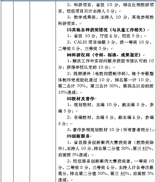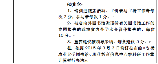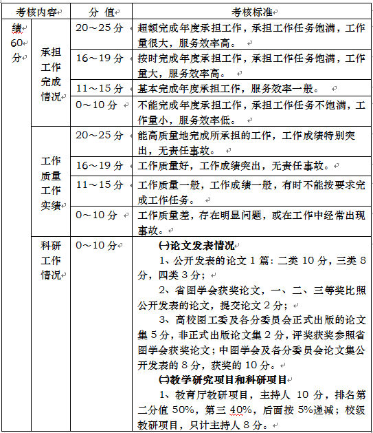 根据学校《关于做好2015年度考核与奖励工作的通知》、《安徽农业大学教职工考核暂行办法》(校行字〔2015〕2号)的要求,在《安徽农业大学其他专业技术人员考核细则》中关于“绩”60分的具体计分原则由各单位结合实际自行制定。为做好2015年度的考核工作,结合图书馆、现代教育信息中心工作的实际,特制定本实施细则。